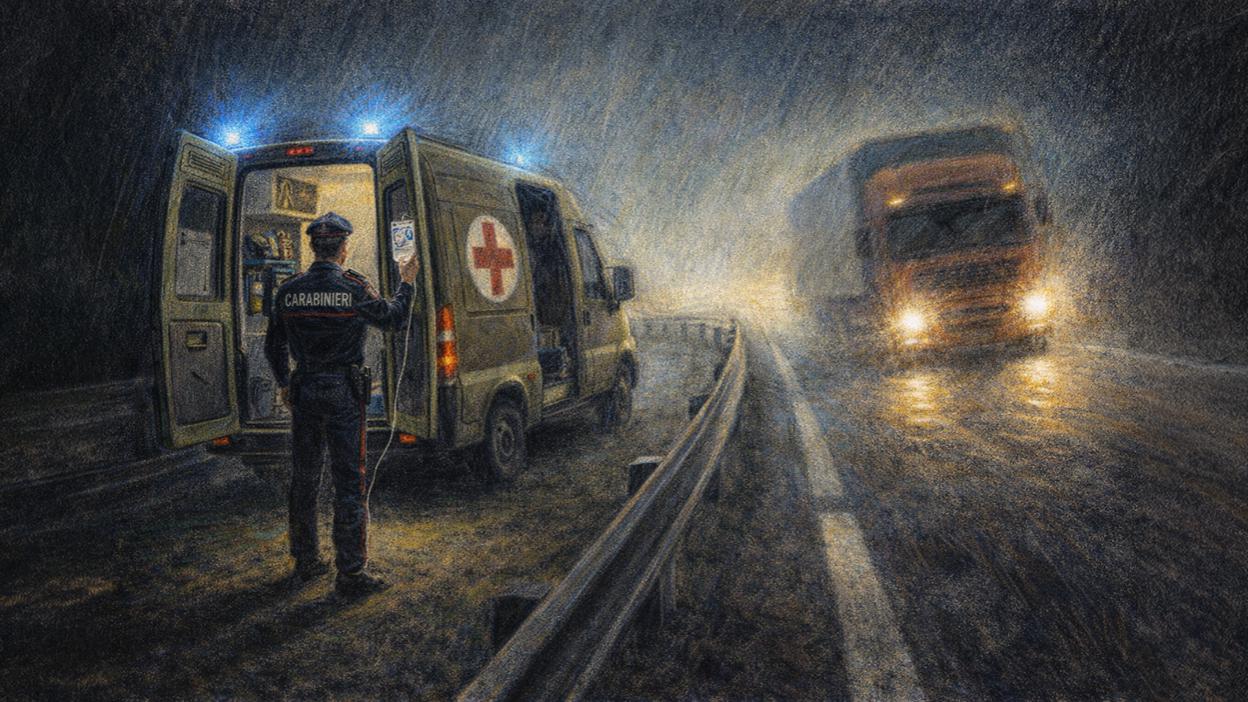 In un tratto di autostrada, avvolto dall'oscurità e con il manto stradale privo di segnaletica orizzontale e reso viscido da una scarsa pioggia precedentemente caduta, l’imprevisto: l’ago della fleboclisi del paziente si stacca. Un gesto tecnico minimale, ma vitale, che impone la sosta in corsia d'emergenza. Aiutato dal collega che sorreggeva il flacone della flebo, il C.M. si adoperava per il reinserimento dell’ago mentre un autoarticolato piombava sull’ambulanza travolgendo il mezzo e sbalzando C.M. sulla carreggiata dove veniva investito mortalmente.
